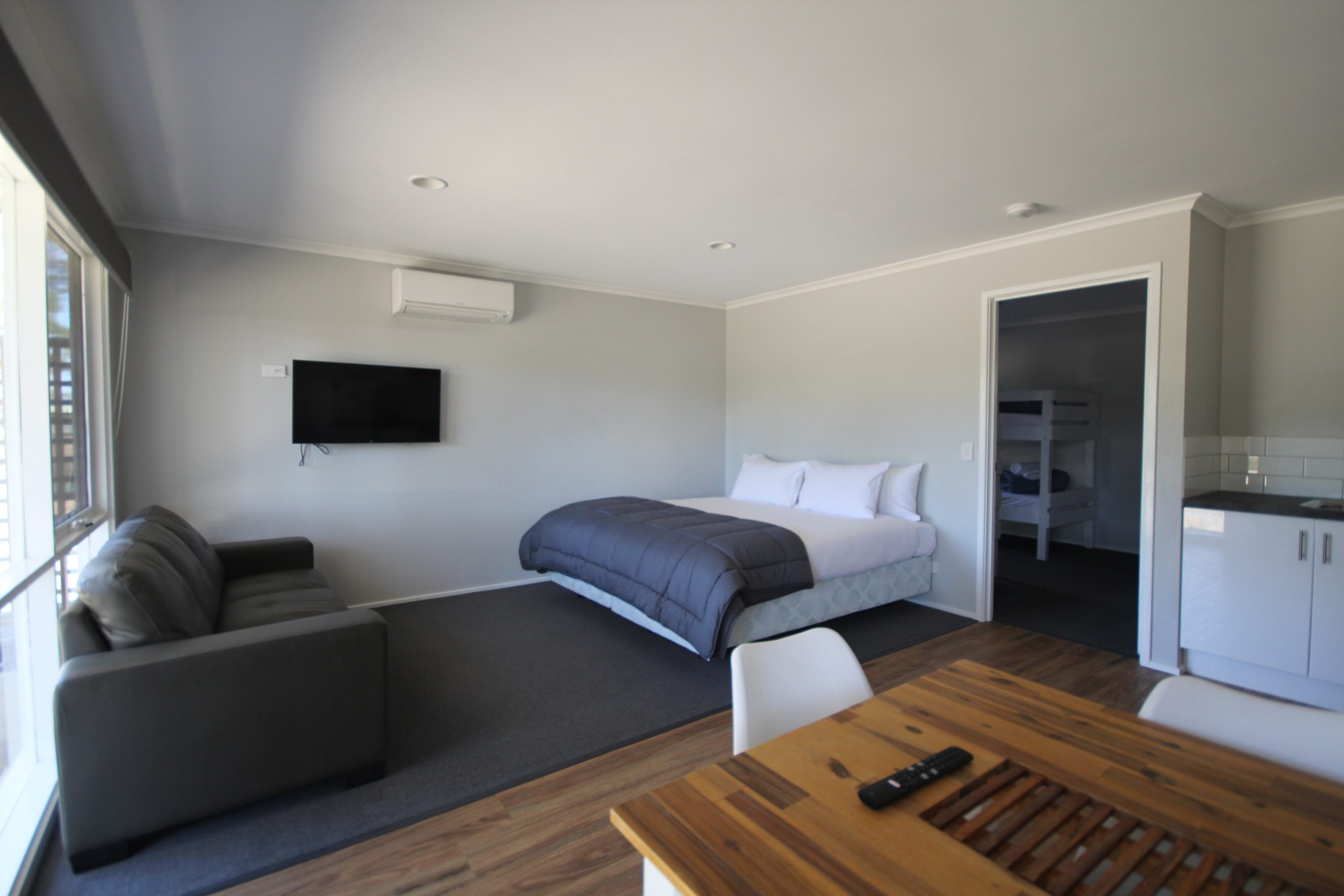 Comfortable and practical, this room includes an open-plan area with queen bed, lounge and kitchenette, plus a separate room with bunks. A great option for families and small groups wanting space and convenience.