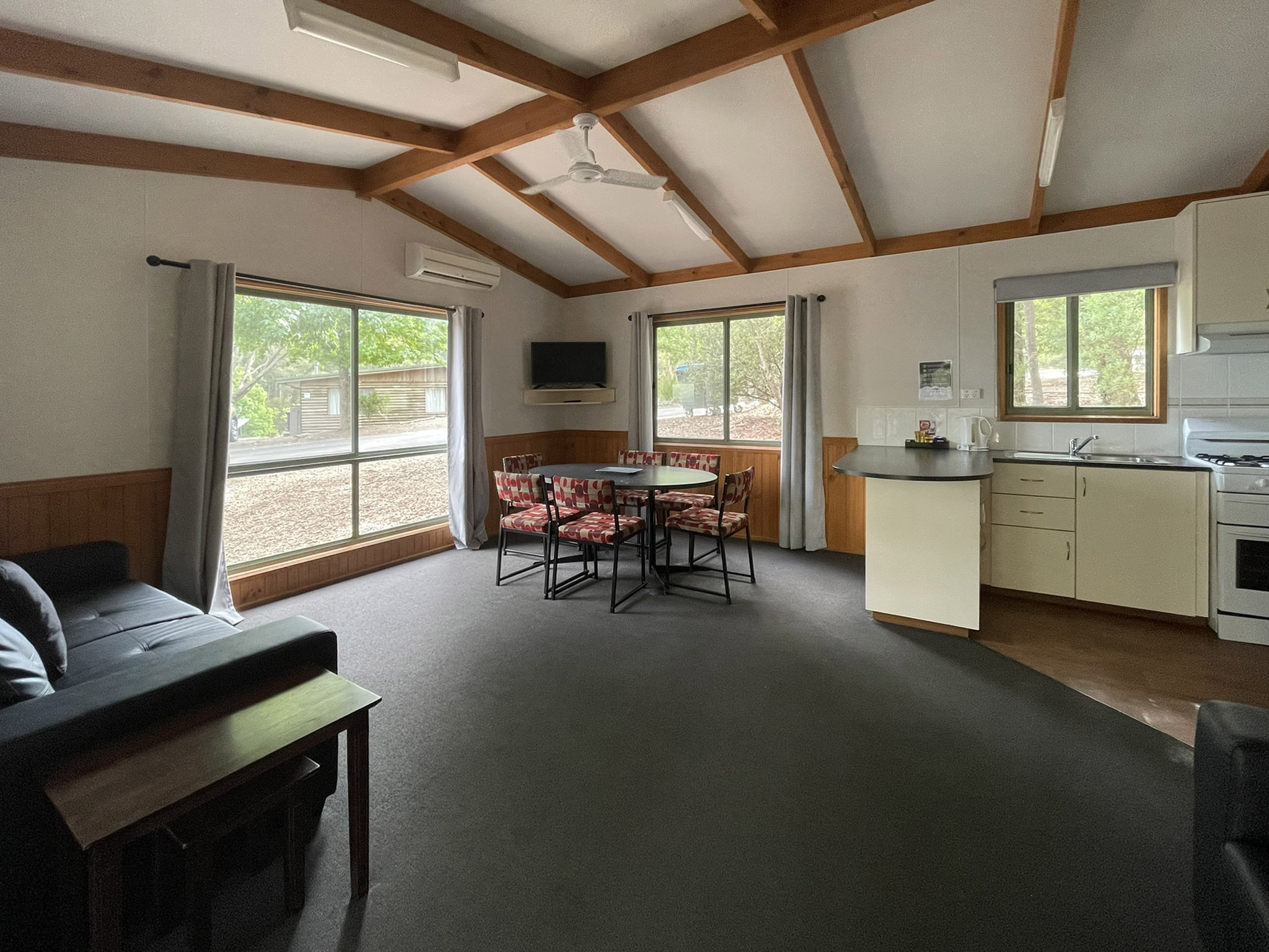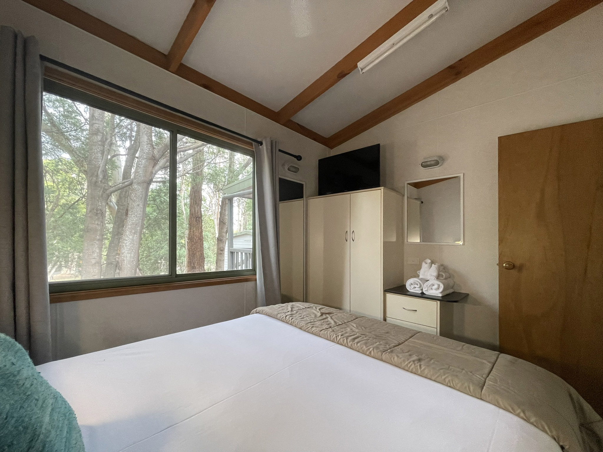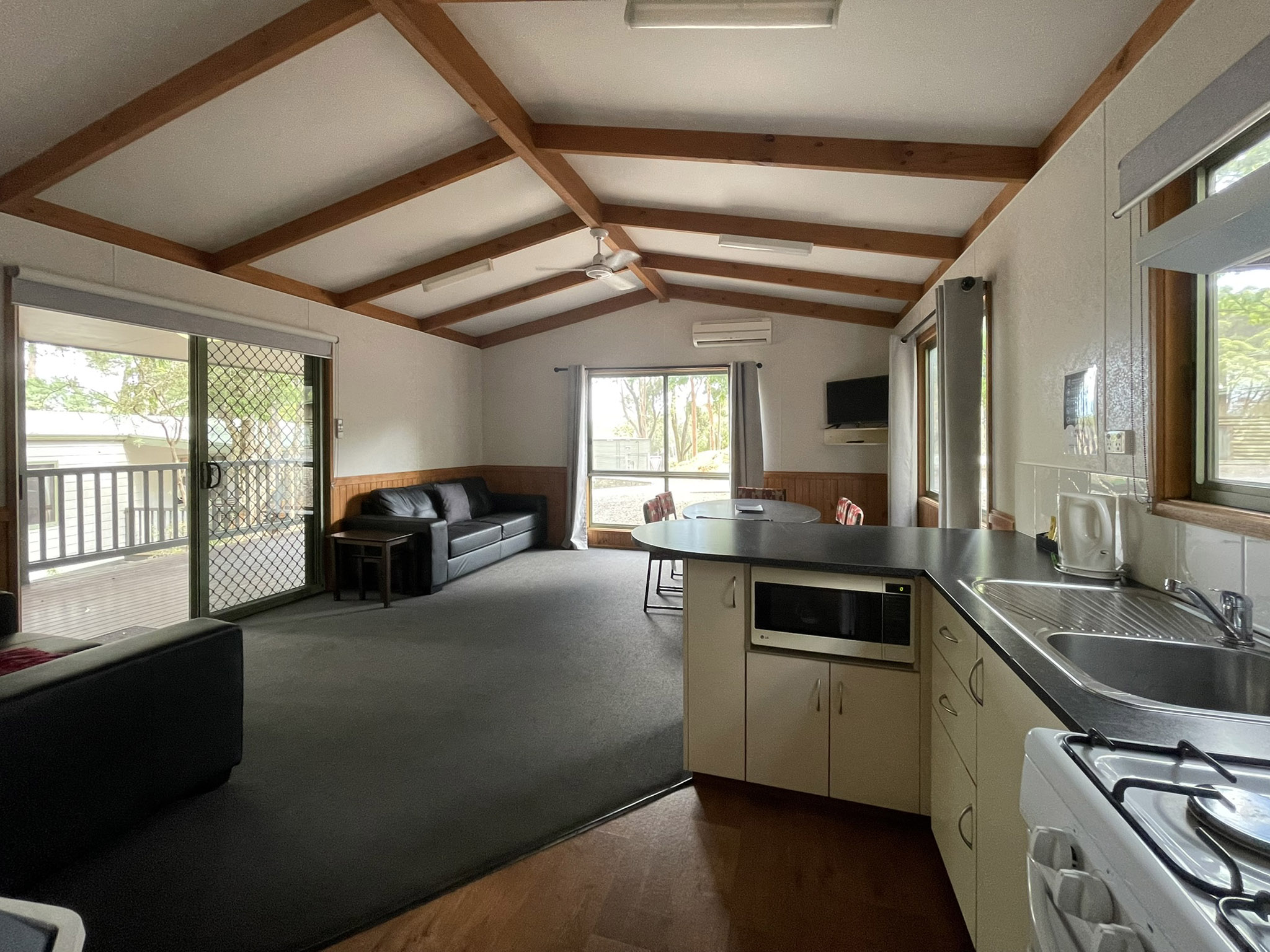 Ideal for families needing extra space, this three-bedroom cabin sleeps six and includes a full kitchen, open-plan living, dining area, and a verandah for laid-back evenings among the trees.