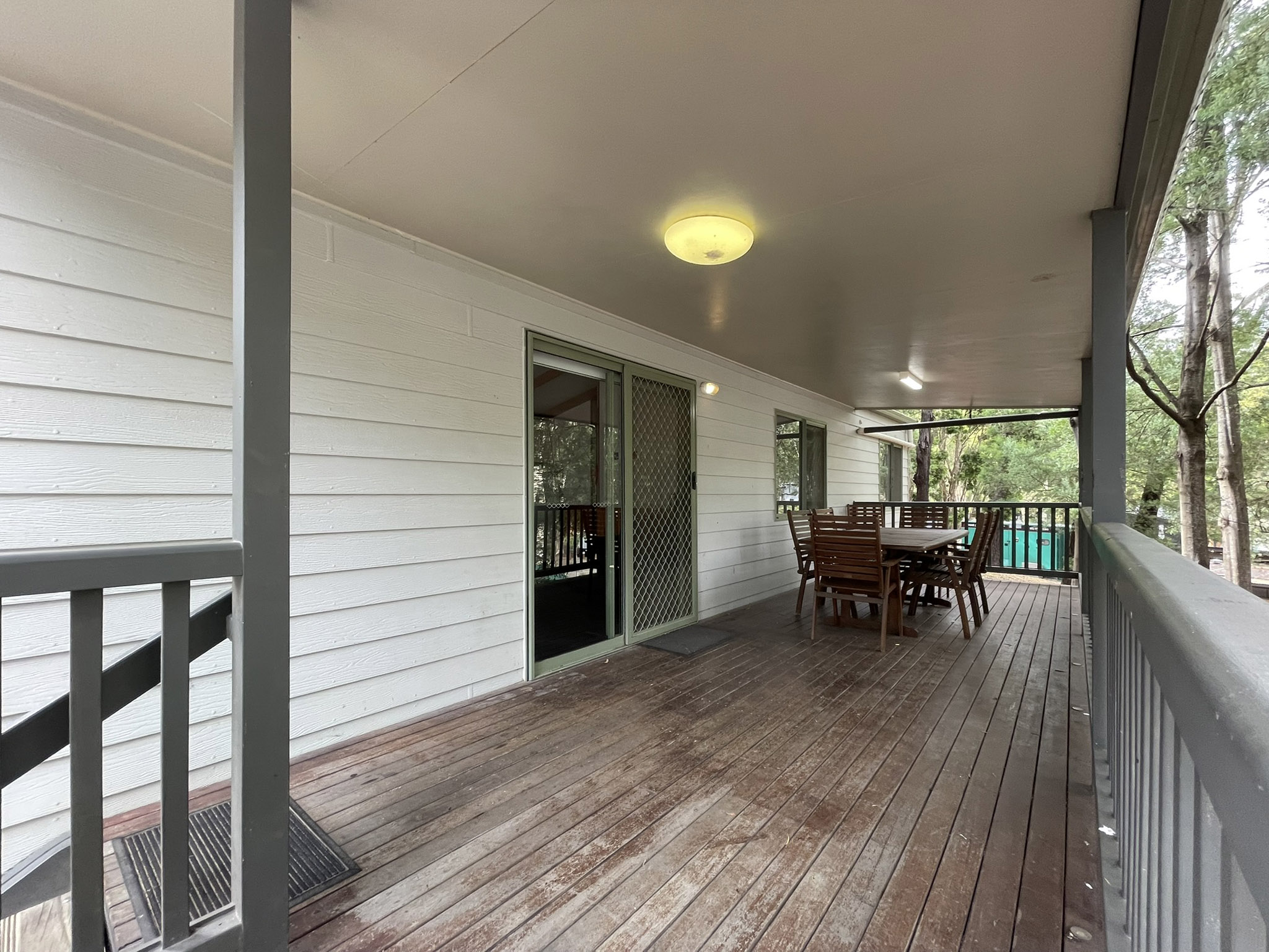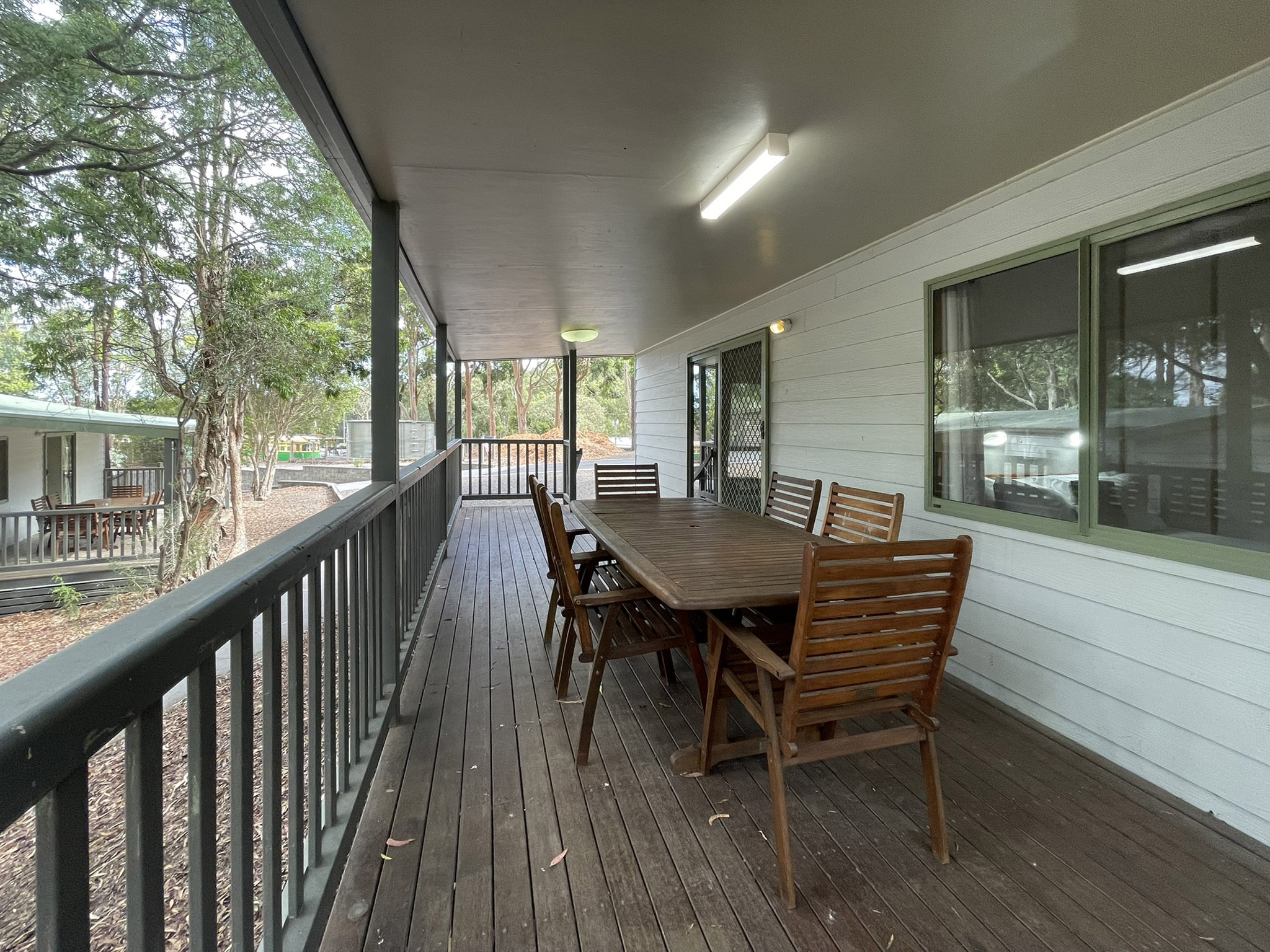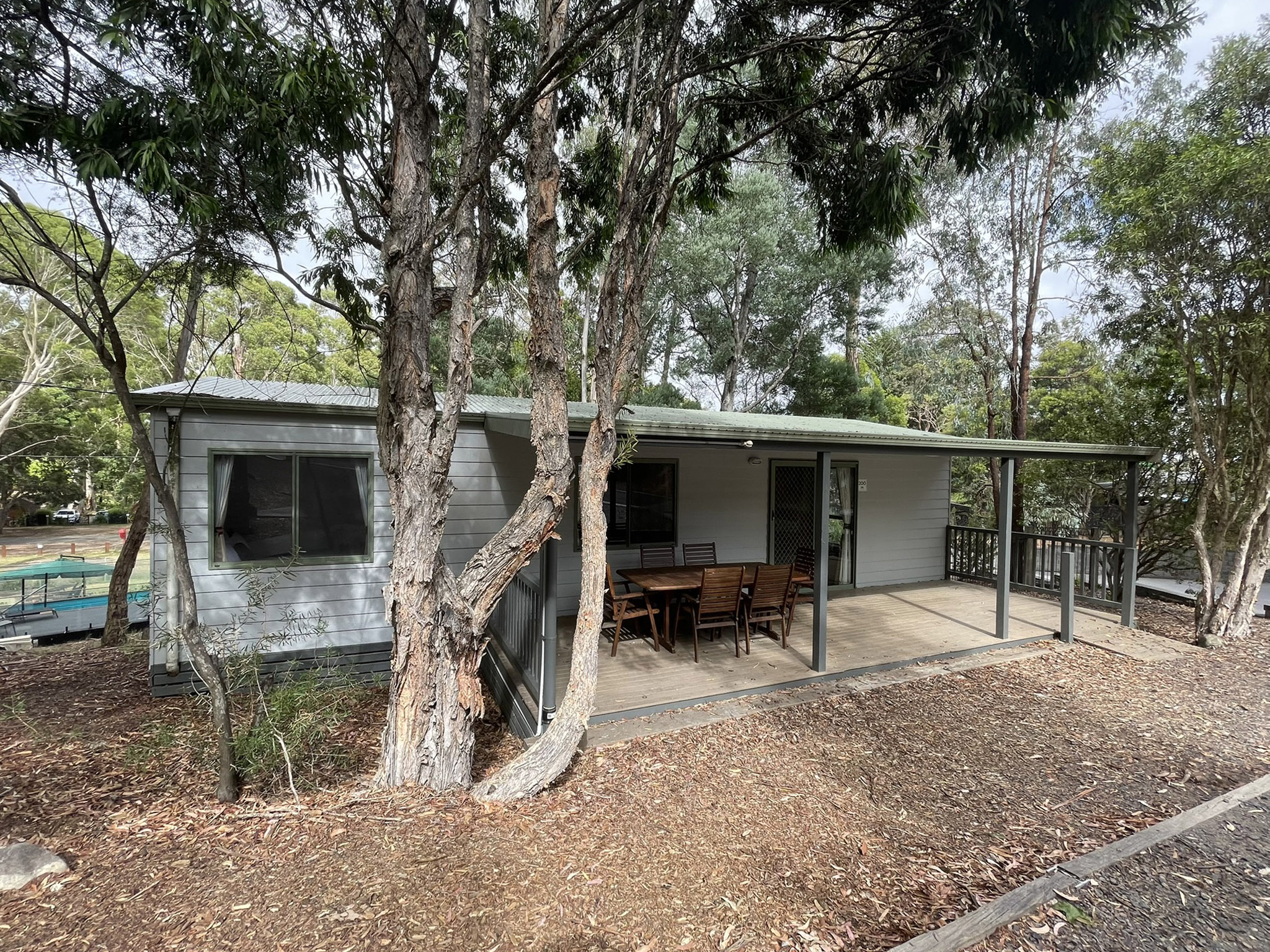 Ideal for families needing extra space, this three-bedroom cabin sleeps six and includes a full kitchen, open-plan living, dining area, and a verandah for laid-back evenings among the trees.