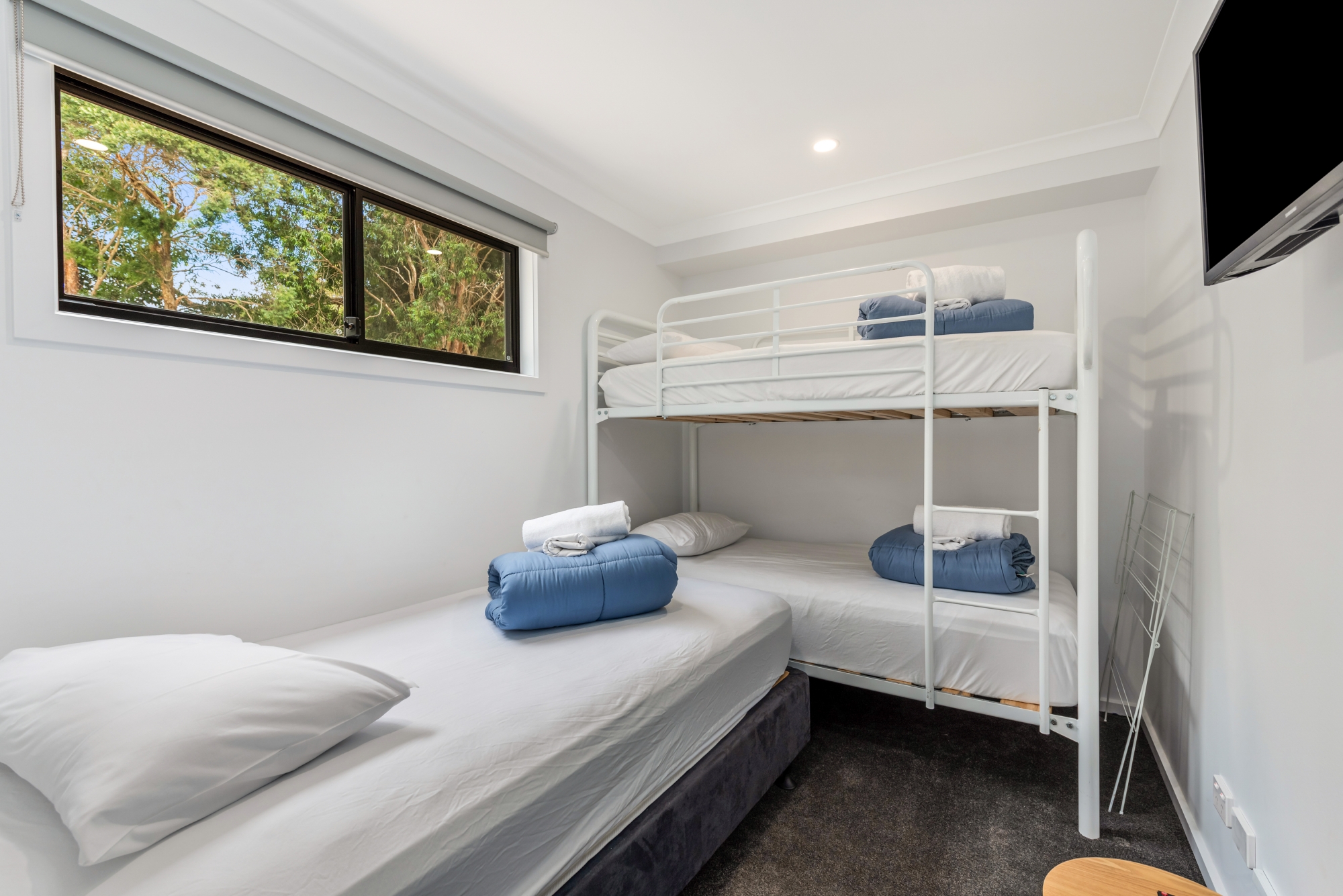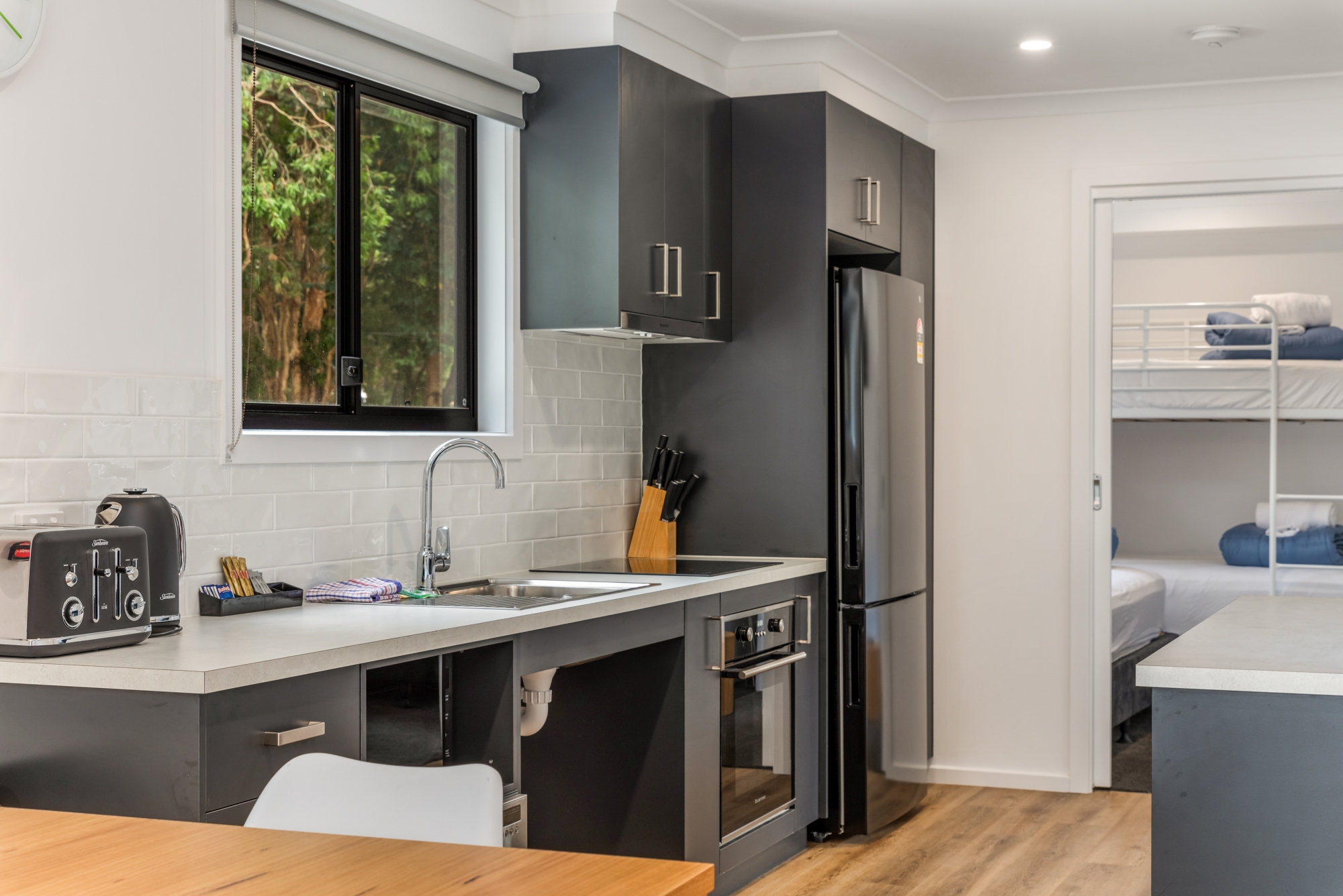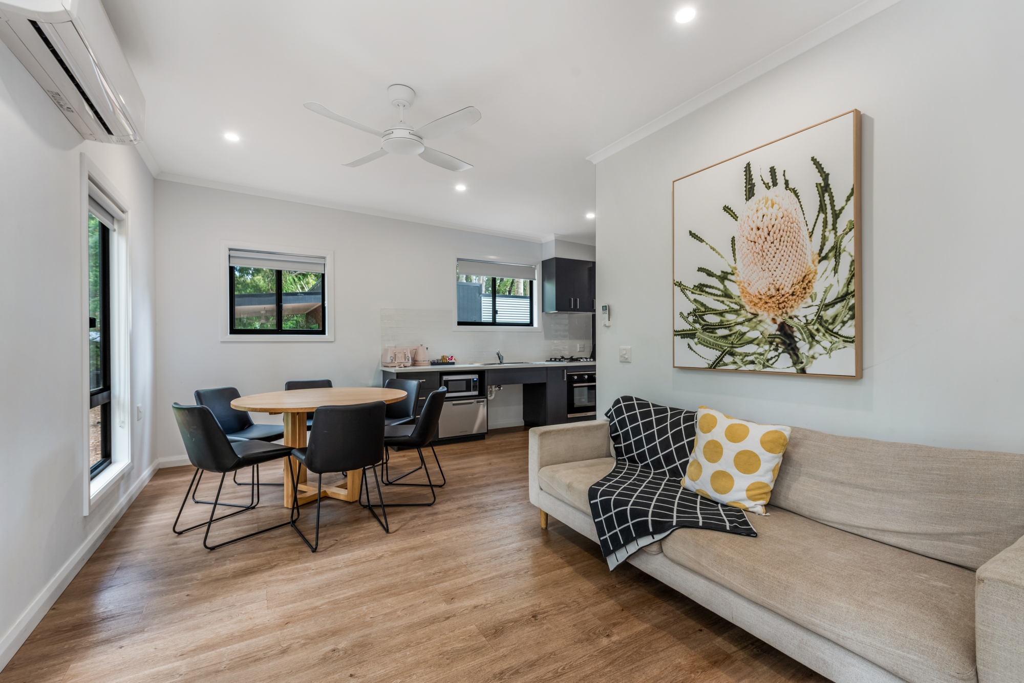 Designed for accessibility, this spacious cabin includes lowered benchtops, accessible appliances, a roll-in bathroom, and a verandah. Sleeping five, it’s perfect for a relaxed and inclusive stay in the Yarra Valley.