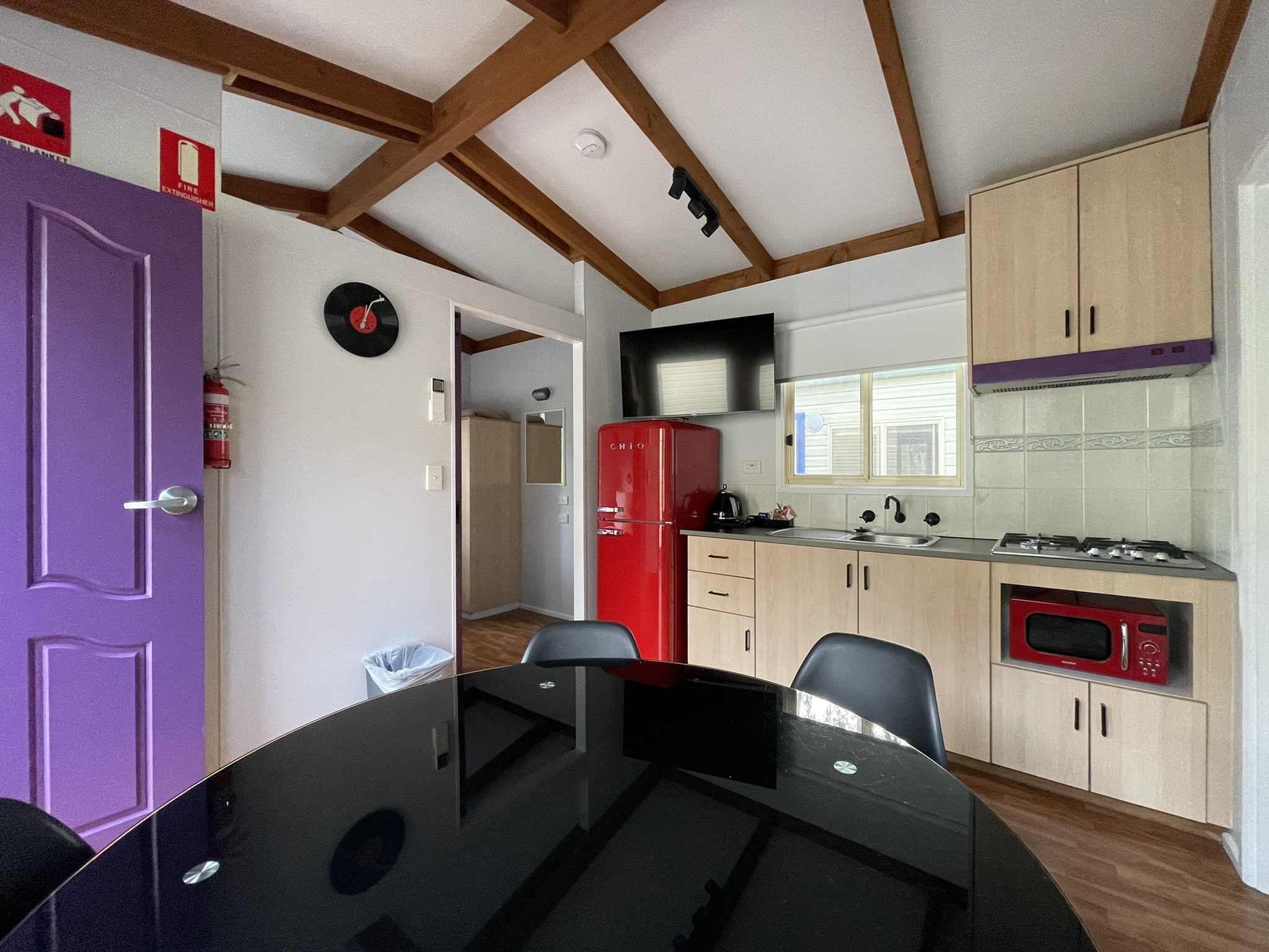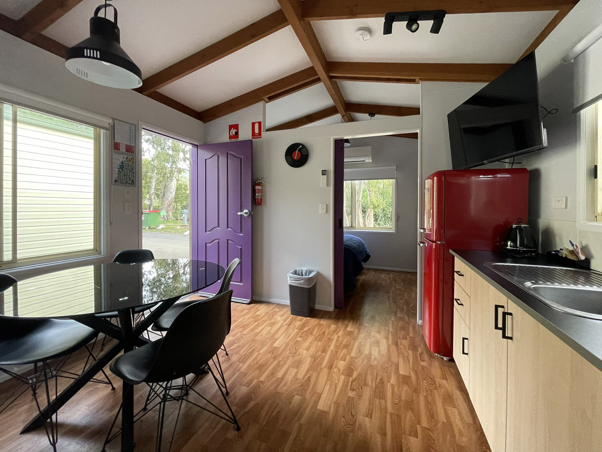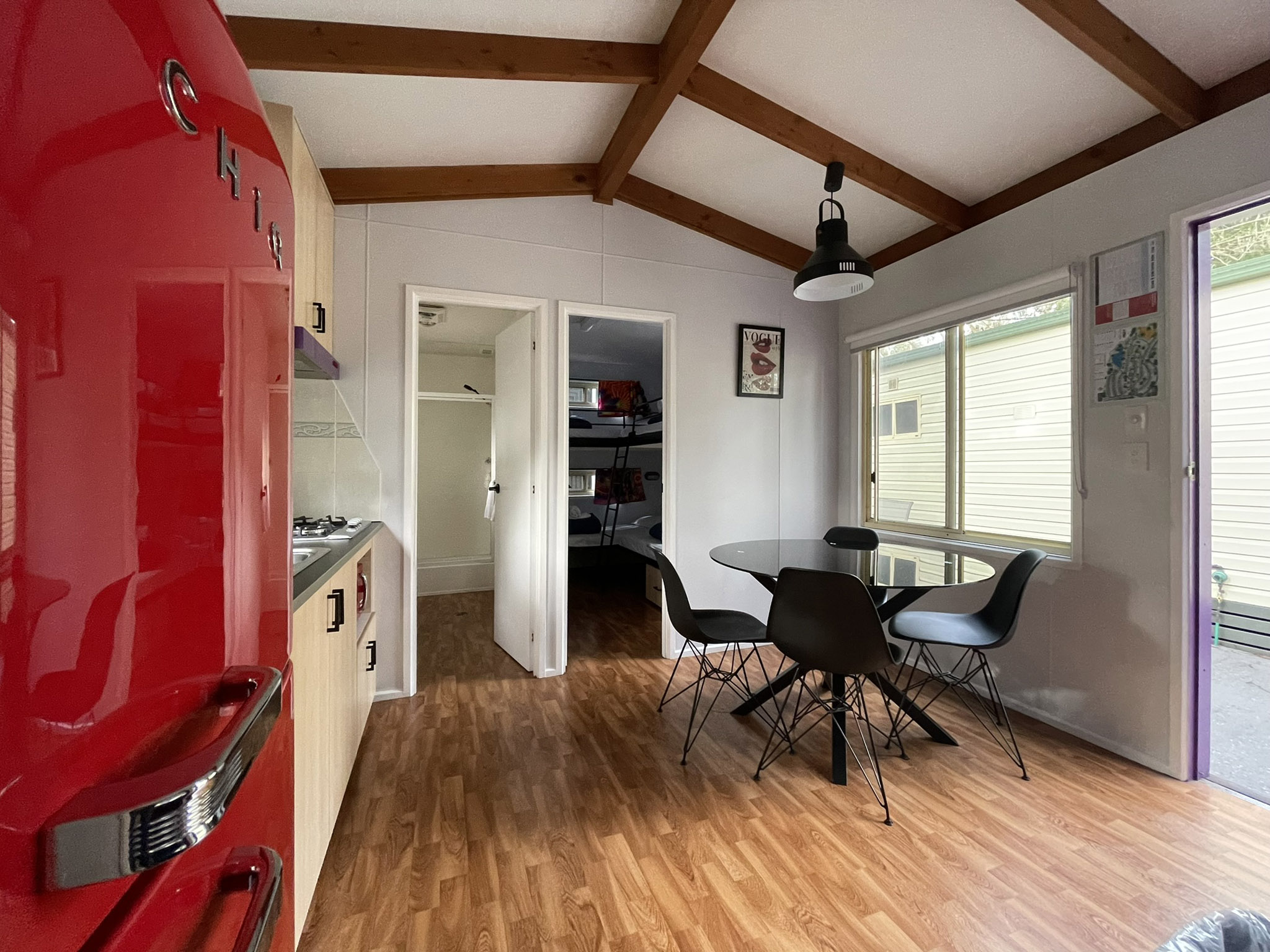With a fun vintage flair, this retro-inspired cabin sleeps six and offers a cosy kitchenette, dining setting, and charming touches that make it a memorable base for your stay.